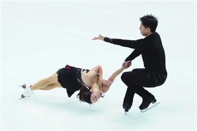 11月7日,中国组合隋文静(左)/韩聪在双人滑短节目比赛中。他们以74.63分的成绩位列第一名。