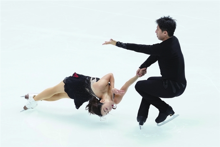 11月7日,中国组合隋文静(左)/韩聪在双人滑短节目比赛中。他们以74.63分的成绩位列第一名。 当日,2025年世界花样滑冰大奖赛日本站双人滑短节目比赛在日本大阪举行。 新华社发