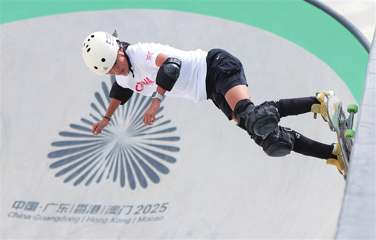 当日,第十五届全国运动会滑板女子碗池赛半决赛在广东惠州举行。新华社发