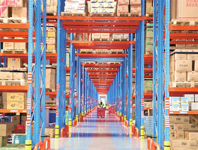 11月11日,在河南省南阳市万德隆大型综合产业园物流配送中心,工人在仓库运送商品。