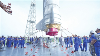 ■11日,发射场工作人员对长八甲遥五火箭进行吊装作业。