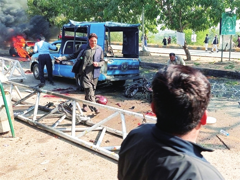 ■ 11月11日,在巴基斯坦首都伊斯兰堡,安全和救援人员检查爆炸现场(手机照片)。新华社 发