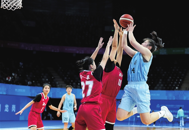 当日,在广东省深圳市举行的第十五届全国运动会篮球女子22岁以下组小组赛中,江苏队97比59战胜湖北队。新华社发