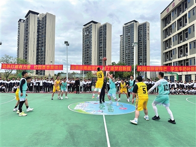 赛场上,队员们激烈拼抢、默契配合,一旁观战的学生热情呐喊,现场气氛火热。
