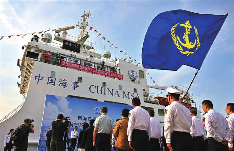 11月13日在海口拍摄的“海巡176”轮列编仪式现场。 11月13日,由我国自主设计建造的2000吨级大型航标船“海巡176”轮正式列编交通运输部南海航海保障中心。 据了解,“海巡176”轮总长75.2米,型宽14米,满载排水量2360吨,是目前全国交通运输系统最大最先进的航标作业船。该船列编后将承担南海海区航标布设、维护任务,为我国在南海的海洋资源开发、科研考察、海上执法等活动提供可靠的航海保障。 新华社发