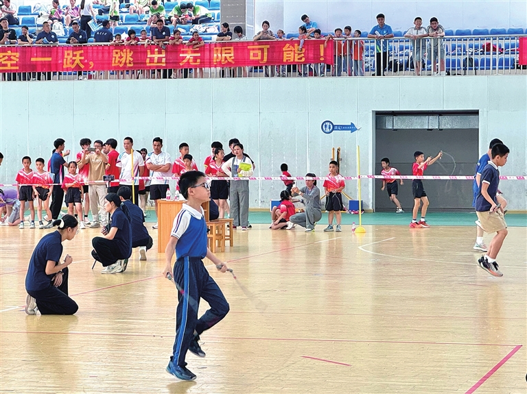 ■参赛选手们在赛场上展现扎实的跳绳能力。 日前,河源市首届中小学师生跳绳锦标赛在河源高级中学举行。本次赛事由市教育局、市文化广电旅游体育局联合主办,共有来自42所中小学的88支代表队、近900名师生参与角逐。 经过激烈角逐,源城区黄子洞小学获小学乙组团体总分第一名,河源市第四小学获小学甲组、教师组团体总分第一名,龙川第一实验学校获初中组团体总分第一名,河源高级中学获高中组团体总分第一名。 本报记者邹茹玉摄