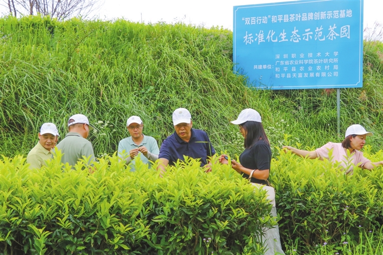 为实现茶产业的长效发展,深职大积极构建“政校行企”协同机制,联合省农科院茶研所、县农业农村局、天富公司等共建品牌创新示范基地,打造综合服务平台;推动县农业农村局争取专项资金100万元支持茶企,和平县科创中心为茶叶项目立项并拨付经费27万元,用于创新基地建设、工艺提升、套种研究等;与龙头企业围绕基地建设,在人才培养、产品创新、品牌打造、科技小院等方面开展全方位合作。