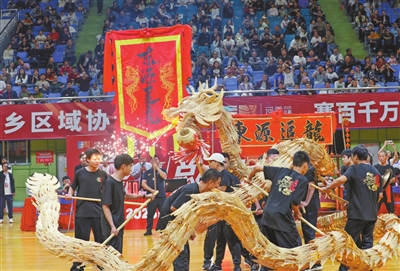 当中场休息的哨声响起,意料之外的精彩瞬间点燃了全场。来自东源上莞的“追龙”表演登场。伴随着激昂的锣鼓声,闪着金色光芒的“龙身”在队员们娴熟的操作下翻腾起舞,这一充满力量与吉祥寓意的民俗表演,瞬间引燃了观众席,欢呼声与掌声此起彼伏,将赛场气氛推向了又一个高潮。紧接着,活力四射的歌唱与啦啦队舞蹈表演轮番上阵,青春洋溢的舞步和激昂奋进的歌声,为场下休整的球员们加油鼓劲。