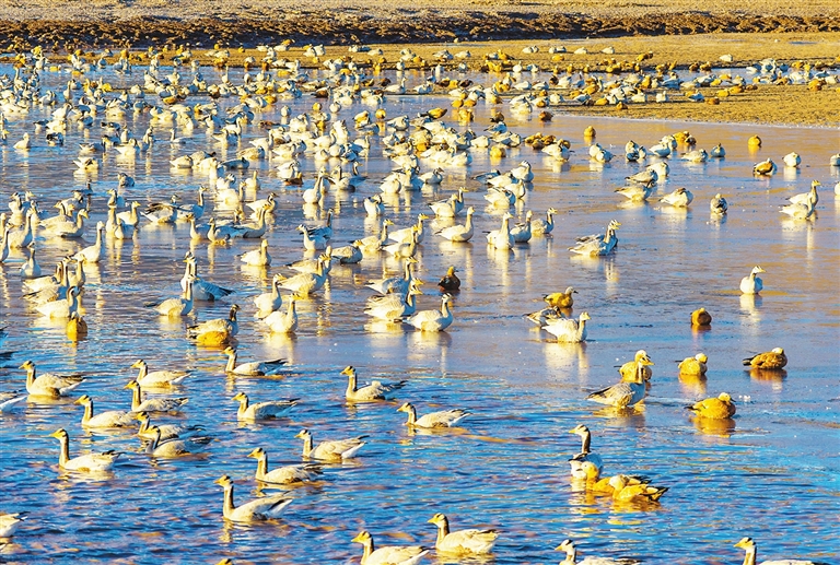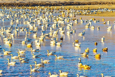 冬日时节,拉萨市林周县迎来大批越冬候鸟,黑颈鹤、斑头雁、赤麻鸭等候鸟在河谷、湖泊等地觅食、休憩。 新华社发