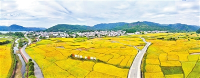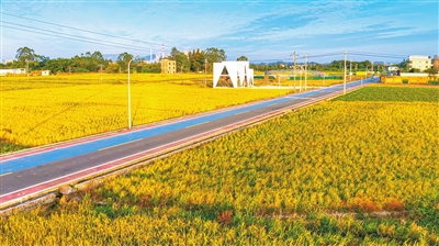 ■源城区埔前镇莲塘岭村的金色稻穗与“彩虹村道”相映成趣。