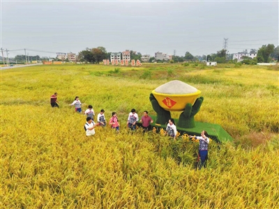 ■桂佳公司的稻田基地一片金黄,游客穿梭其中,打卡好“丰”景。本报记者 孙红 摄