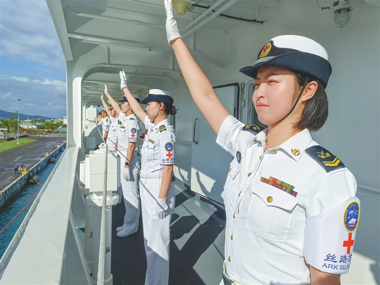 ■中国海军“丝路方舟”号医院船官兵向欢迎人群挥手致意。    新华社 发