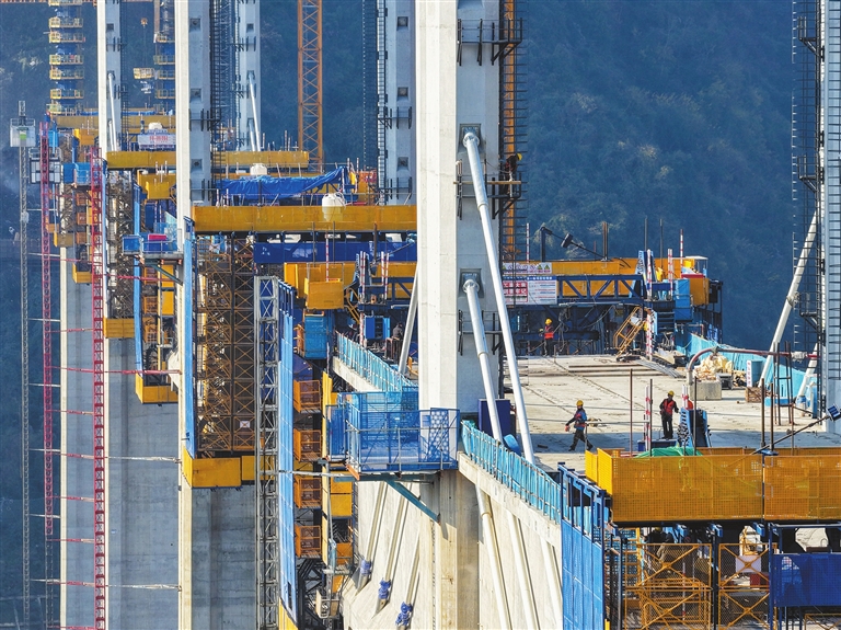 这是12月7日拍摄的西渝高铁任河特大桥建设现场(无人机照片)。 12月7日,由中铁十二局承建的西渝高铁城口任河特大桥塔柱施工任务全部完成,全桥施工进度完成近七成,为西渝高铁全线按期贯通奠定了基础。 城口任河特大桥位于重庆市城口县境内,为西渝高铁康渝段重难点工程,全长1180.52米。西渝高铁是我国“八纵八横”高铁网北京至昆明的京昆通道和包头、银川至海口的包(银)海通道的重要组成部分,线路全长739公里,设计时速350公里。 新华社发