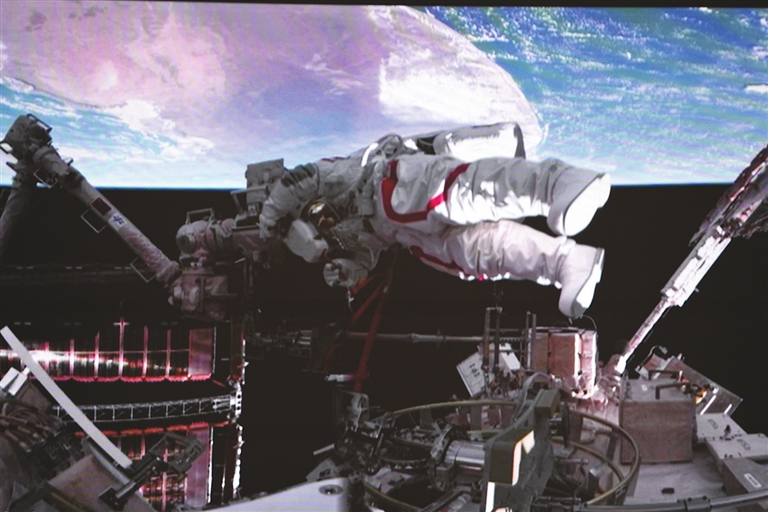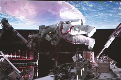 这是12月9日在北京航天飞行控制中心屏幕上拍摄的神舟二十一号乘组航天员张陆在舱外工作的画面 新华社 发