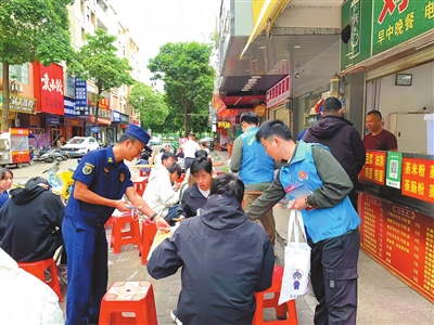 ■活动现场,消防员与河源职业技术学院消防社团学生深入社区商户与居民住户,发放宣传资料。本报记者 肖斌 摄