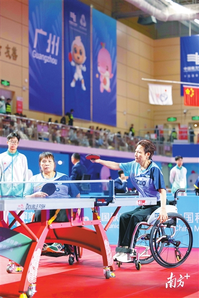 ■12月9日,在乒乓球TT5女子双打小组赛中,黄丽明(右)撑起身子击球。 “我63岁了,比她们都大至少10岁呢。”作为本届残特奥会广东省代表团中年龄最大的运动员,黄丽明提起年龄,笑声爽朗。黄丽明1岁时患上小儿麻痹症,行动被困于轮椅,但人生的半径却通过体育不断扩展。在曾是轮椅篮球运动员的丈夫引导下,她推开了体育运动这扇门,从此人生走向开阔地带。 对于未来,黄丽明没有设定退役的时间表。“一直打到打不动为止。”她说。 南方+客户端发