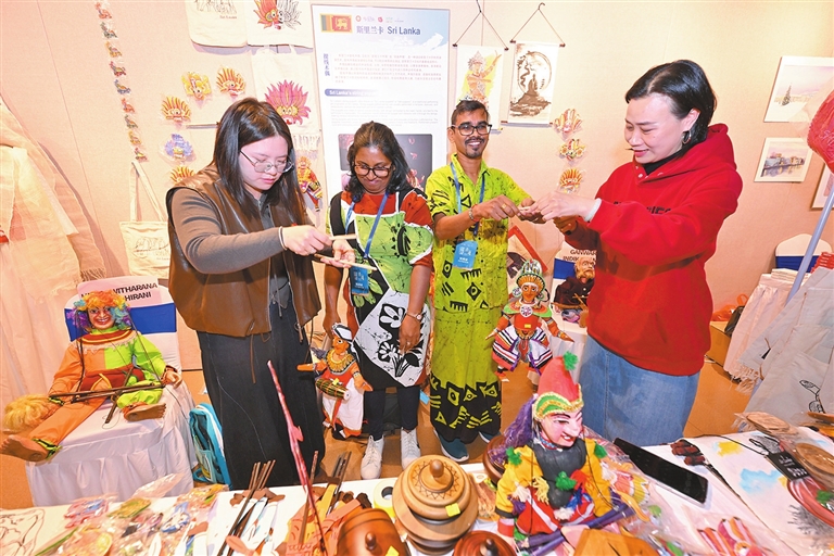 ■12月12日,游客在海上丝绸之路非物质文化遗产展演活动上体验斯里兰卡提线木偶。
