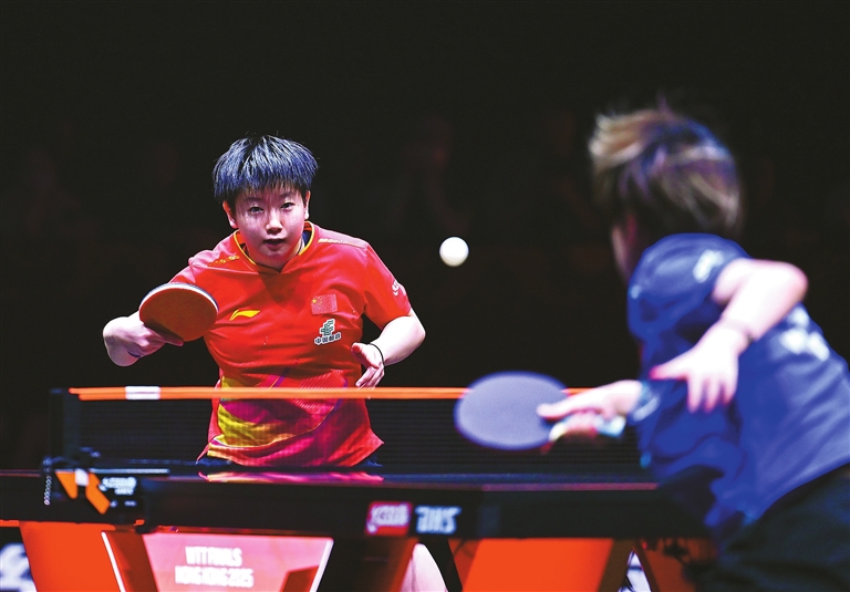 当日,在香港进行的2025年世界乒乓球职业大联盟(WTT)总决赛女单八分之一决赛中,中国选手孙颖莎4比0战胜队友王艺迪,晋级八强。新华社发