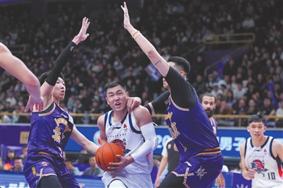 ■12月13日,山东高速队球员高诗岩(前中)在比赛中带球进攻受阻。 当日,2025—2026赛季中国男子篮球职业联赛(CBA)开赛。在第一轮比赛中,北京控股队主场97比92战胜山东高速队。新华社发