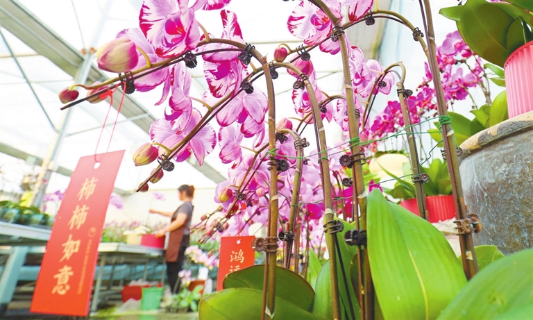 12月17日,在河北省石家庄市藁城区廉州镇一家花卉种植基地,工作人员在做蝴蝶兰花卉造型。