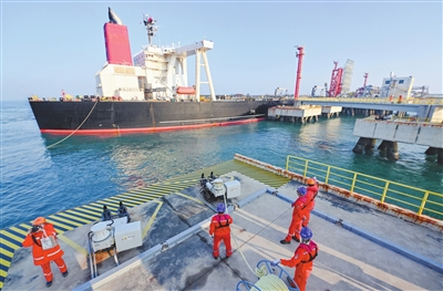 ■12月18日,国投洋浦油储码头工作人员在为装载石化原辅料的船舶系缆绳。 新华社 发