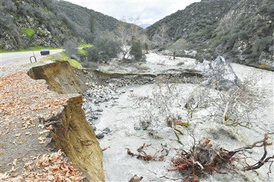 ■这是12月25日在美国加利福尼亚州洛杉矶县阿祖萨市附近拍摄的因水位大幅度上涨而受到冲击的河床。