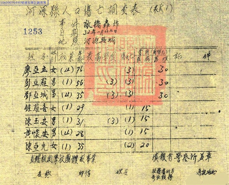 1945年《河源县抗战损失调查统计表》载:自1938年至日军投降前夕,先后共有64架次日机侵扰,滥炸河源城乡,投弹253枚,燃烧弹20多枚,炸死群众120人,其中男性84人,女性36人,炸毁民房978间,损失价值共计国币1237.025亿元。另外一份战后《广东省河源县抗战期间被灾损失情况表》中显示,河源县原有人口201901人,死亡190人,受伤235人,流亡275人。境内发生抗战小战8次。