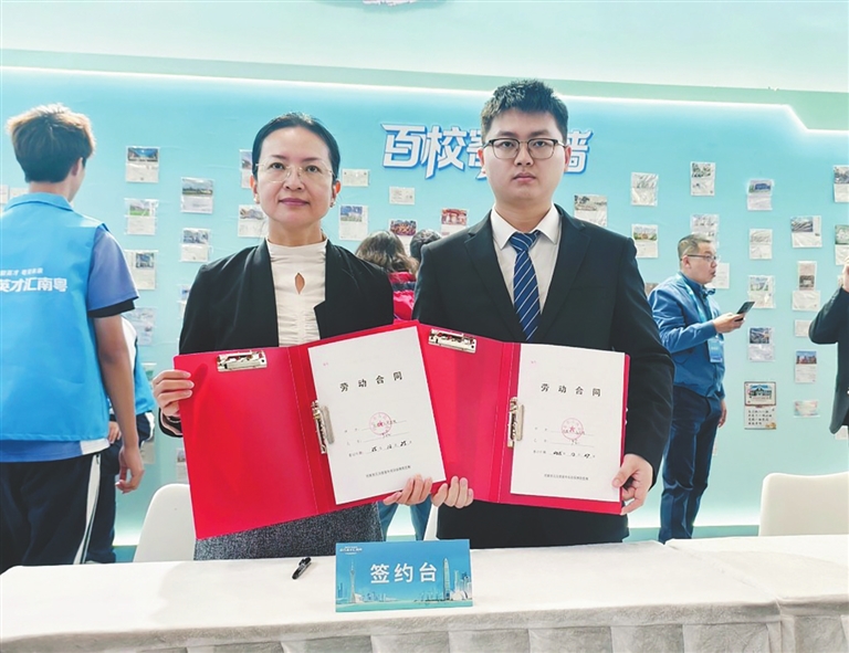 外地求职者被河源的生态、产业和政策吸引。招聘会现场,广东医科大学毕业生林晓峰当场签约西可通信公司行政岗。他说,河源离粤港澳大湾区近,有万绿湖的生态优势,生活节奏适中,是扎根就业的理想选择。来自赣南医科大学的罗鑫,选择市人民医院,“河源离赣州近,饮食文化相似,三级甲等医院的平台能让我稳步成长”。