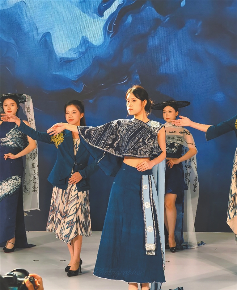 “这抹靛蓝,染着600年客家记忆,也映着河源的发展活力。”前日,深圳会展中心1号馆内,随着舒缓的背景音乐响起,12名模特身着墩头蓝非遗时装缓缓步入T台,有的是单肩剪裁的短款上衣,配渐变靛蓝长裙,裙摆侧边缀着银线勾勒的传统纹样与流苏装饰;有的以透纱披肩搭不对称裙摆,朦胧面料上晕开的蓝染纹理,让客家古韵多了几分轻盈;还有的造型搭配了复刻传统客家银饰的头饰,银片流苏随步伐轻晃,与深靛蓝的礼服廓形碰撞出古今交融的层次感。这场“古韵新织·蓝耀河源”非遗时装秀,吸引了众多求职者驻足观看,不少人掏出手机拍摄,“第一次见这种设计,颜色很高级,衣服也很漂亮、很有特色”。