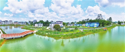 ■今年建成的紫金县蓝塘镇砂糖村绿美生态小公园,在蓝天白云的映衬下,湖泊碧波荡漾,环湖亲水步道干净整洁,绿树环绕,呈现出一幅生态宜居的美丽画卷。