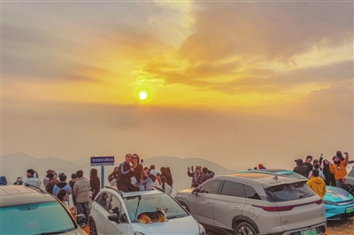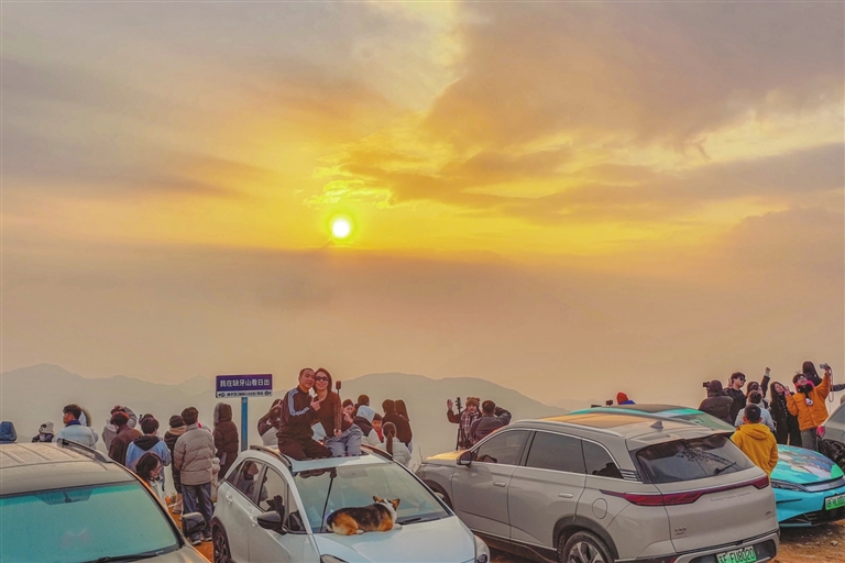 昨日清晨,在东源县曾田镇缺牙山山顶,近百名市民、游客齐聚于此迎接新年第一缕阳光。其中,不乏来自广州、深圳、湛江、中山、惠州等地的游客。为了等待这一难忘时刻,有市民、游客提前一晚在山顶露营等候。 当阳光出现,市民、游客纷纷举起相机、手机记录光影,热闹又温馨的氛围裹满了新年的第一份暖意。 本报记者杨坚摄