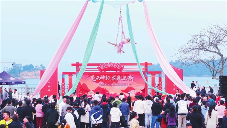 ■万绿湖风景区创新推出“飞天神韵·花舞迎新”暨十二花神“空中芭蕾”演艺,将自然山水与高空艺术完美结合。元旦假期,我市各景区迎来众多游客。本报记者 李何山 杨李维 摄
