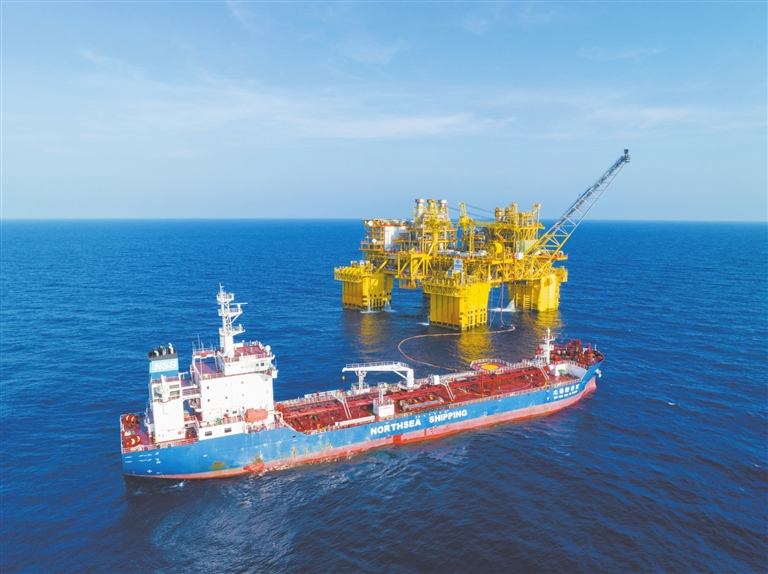 ■穿梭油轮与“深海一号”能源站对接输油。新华社 发