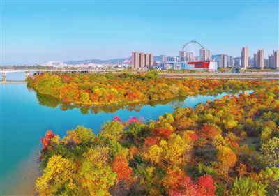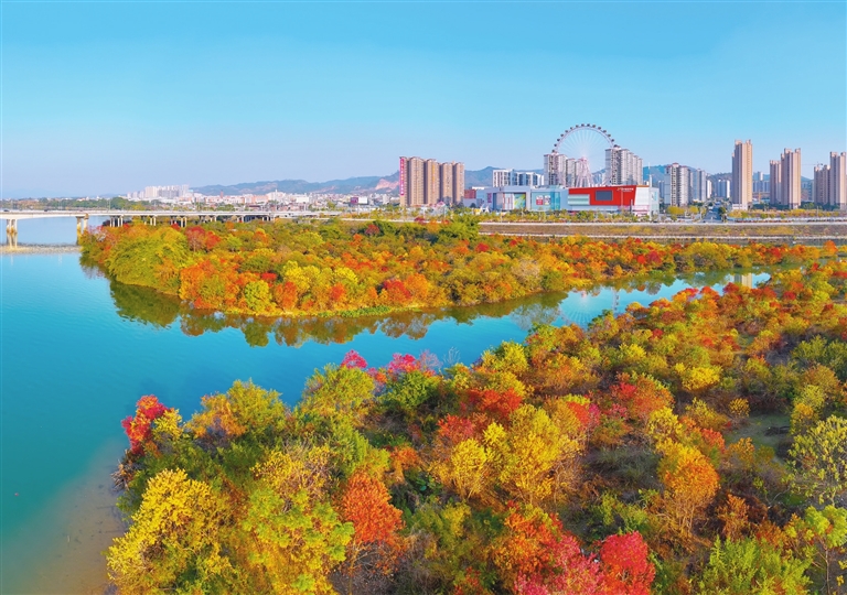 ■近日,市区胜利大桥附近的东江河畔呈现出五彩斑斓的迷人景象。暖阳照耀下,河水波光粼粼,大片的五彩枝叶在河滩上铺展出斑斓画卷,与远处的摩天轮、高楼群及跨江大桥交相辉映,构成一幅都市与自然和谐共生的冬日图景,吸引不少市民、游客驻足观赏?。本报记者肖斌摄