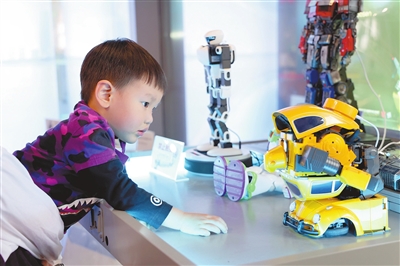 近日,在深圳市龙岗区的全球首家机器人6S店,小朋友与机器人互动。