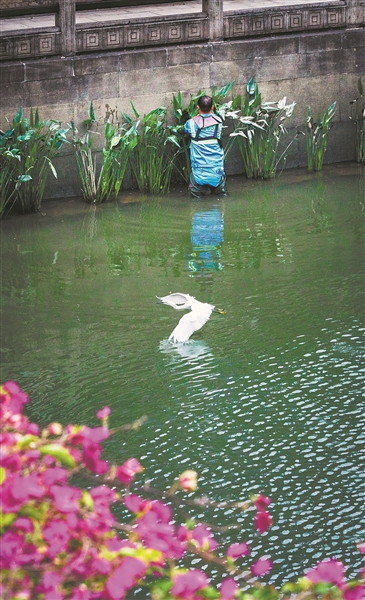 水上环卫工步入猎德涌,轻拂水草,细拾杂物,用双手守护澄澈。飞翔的白鹭掠过水面,见证一幅人与自然和谐共生的画卷。海国 摄