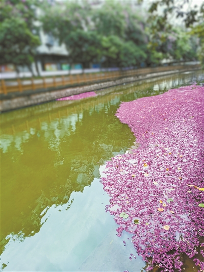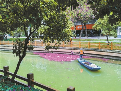 清晨,红花羊蹄甲的花瓣飘落驷马涌,粉色花海与碧波交织成画。水上环卫工驾舟清理,默默守护广州的洁净与美丽。都督 摄