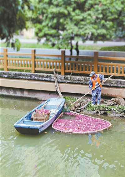 “朝饮木兰之坠露兮,夕餐秋菊之落英。”屈原的诗句,仿佛是城市净水人日常的写照。清晨,他们迎着第一缕阳光,将花瓣一一围拢,手臂挥动间,勾勒出广州河涌的洁净与美丽。傍晚,他们划着小舟离去,带走秋菊般的落英,留下城市的安宁与美丽。每一次轻轻一篙,都是与花瓣的对话;每一声水波轻响,都是对河流的深情告白。他们的劳动,不只是清扫,更是一种无声的守护,一种与自然的默契对话。