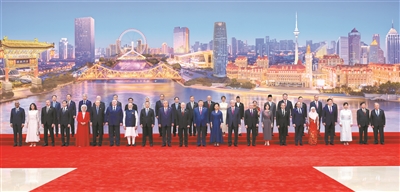 8月31日晚,国家主席习近平和夫人彭丽媛在天津梅江会展中心举行宴会,欢迎来华出席2025年上海合作组织峰会的国际贵宾。这是宴会前,习近平和彭丽媛同贵宾们集体合影留念。 新华社发
