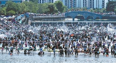 当天下午2时,随着数千斤的鲜活草鱼被投入河中,游客们卷起裤脚、脱了鞋,手持水盆、水枪甚至直接赤手从四周蜂拥而来,纷纷踏入河中。整座山城沉浸在水花与笑声的交响中,新增的徒手抓鱼环节,让这场戏水狂欢多了份“手抓鲜鱼”的野趣。
