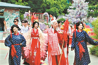 广州日报讯 (全媒体记者陈治家、谢英君 通讯员郭景祎摄影报道)东莞观音山第六届姻缘文化节昨日开幕,活动将持续至10月8日。其间,每个周末都将推出不同主题的巡游互动展演。