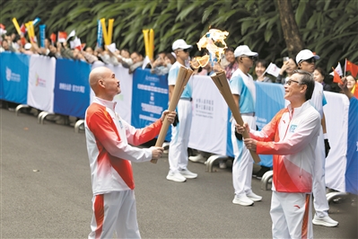 刘平云沿着越秀山上的明代古城墙,将火炬传递到五羊石像广场下方,交棒给第4棒火炬手——南方电网首席科学家、中国工程院院士饶宏。“作为能源电力的科技工作者,参与十五运会火炬传递,感到非常高兴。”饶宏说。