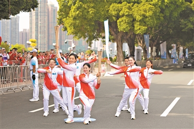 第20棒火炬手组合与第21棒火炬手曾小敏摆出整齐造型向沿途市民展示火炬。广州日报全媒体记者陈忧子 摄