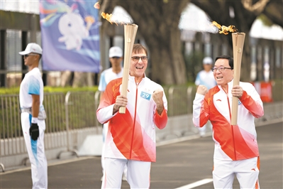 广州站火炬传递临近尾声也迎来了高潮,来自澳门、香港和广州的三位火炬手代表粤港澳三地携手传递最后几棒,体现大湾区深度协同。第48棒火炬手的KNJ(投资)有限公司董事长何敬麟是祖籍广州的澳门人。“能够作为十五运会火炬手,我感到非常光荣!”何敬麟激动地说,此次在广州参与火炬传递意义非凡,同时也对十五运会的成功举办充满期待。何敬麟说,每一场赛事都极具看点,希望广大观众合理安排时间,走进粤港澳不同城市,在观看赛事的同时,领略各地的城市风光。未来,他计划在体育、青年、文化、旅游等多个领域,推动大湾区城市间开展更多联动合作,让体育精神在多元交流中得以延伸和发扬。
