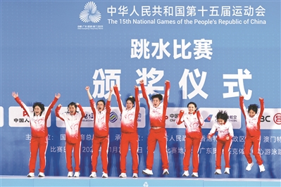 广东女子跳水队在领奖台上庆祝夺冠。广州日报全媒体记者 杨泽彬 摄