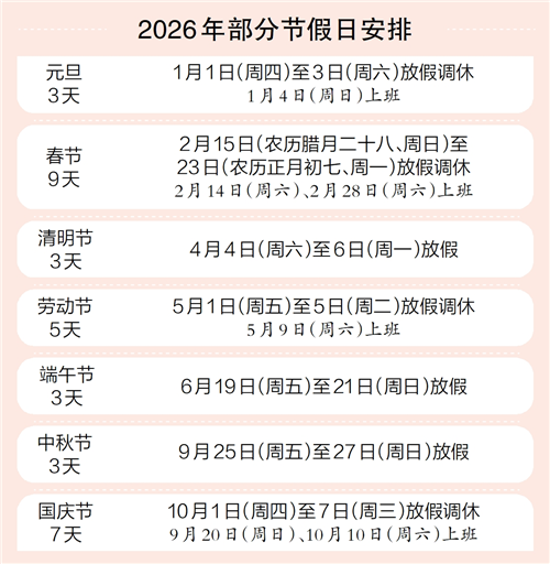 据新华社北京11月4日电 11月4日,国务院办公厅关于2026年部分节假日安排的通知发布。根据通知,2026年元旦、春节、清明节、劳动节、端午节、中秋节和国庆节放假调休日期的具体安排如上图。