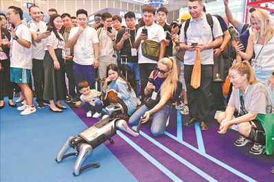 广交会现场人气十足,采购商与机器人互动。(资料图) 广州日报全媒体记者杨耀烨、王燕 摄