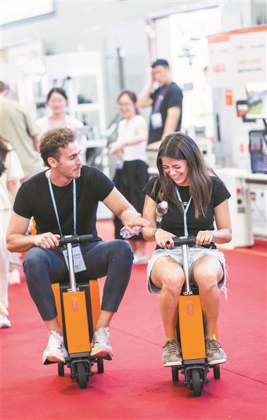 10月17日,采购商在广交会展馆内体验骑行行李箱。 广州日报全媒体记者庄小龙 摄