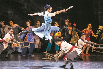 在舞蹈本体方面,面对当下“重意境轻舞蹈”的倾向,以扎实的舞蹈语汇推进叙事。茶馆中双人过招行云流水,练武场上男女双人舞细腻传神,三人舞、四人舞编排匠心独具。群舞段落更是精彩纷呈,南拳队阵气势如虹,群狮共舞震撼人心。