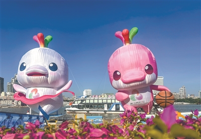 这次,两只吉祥物分别以艺术体操和篮球造型和市民朋友“见面”,萌趣可爱,既生动呼应赛事主题,又象征拼搏与团结的体育精神。两只高达15米的吉祥物,不仅具有强烈的视觉震撼力,也寓意第十五届全国运动会。